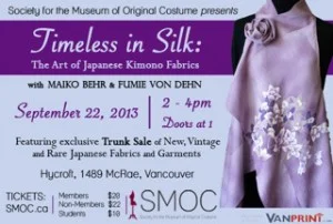 Japanese culture specialist and guest SMOC lecturer Maiko Behr provides an introduction to the dazzling diversity of traditional kimono silks, offering an intimate look into minute details of the production process. Featuring examples from the antique kimono collection and original fashions of Vancouver collector/designer Fumie Von Dehn, this special show will trace Japanese silk through centuries-old techniques of craftsmanship to Western-inspired designs of the early 20th century. Live models will present contemporary designs that reveal a deep understanding of and respect for these materials while giving them new life.